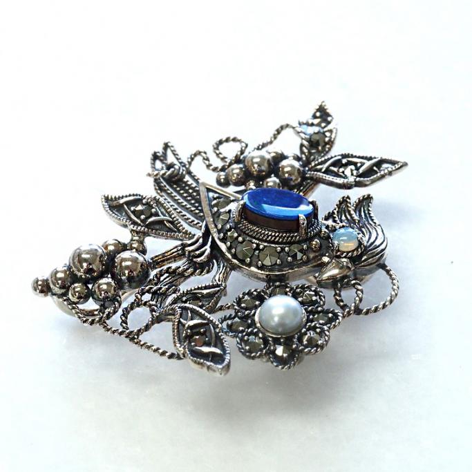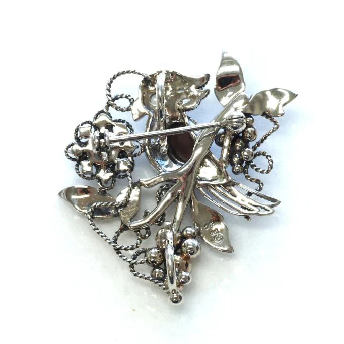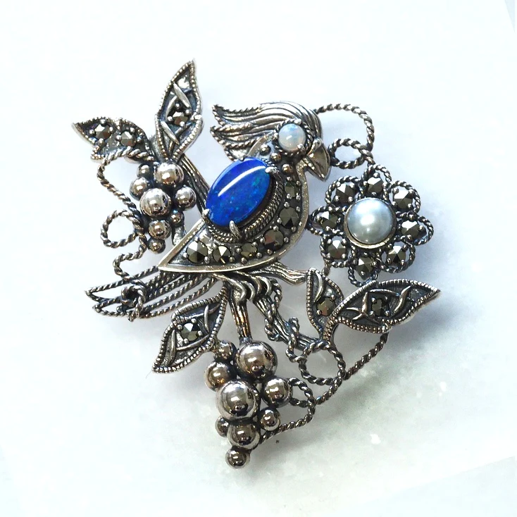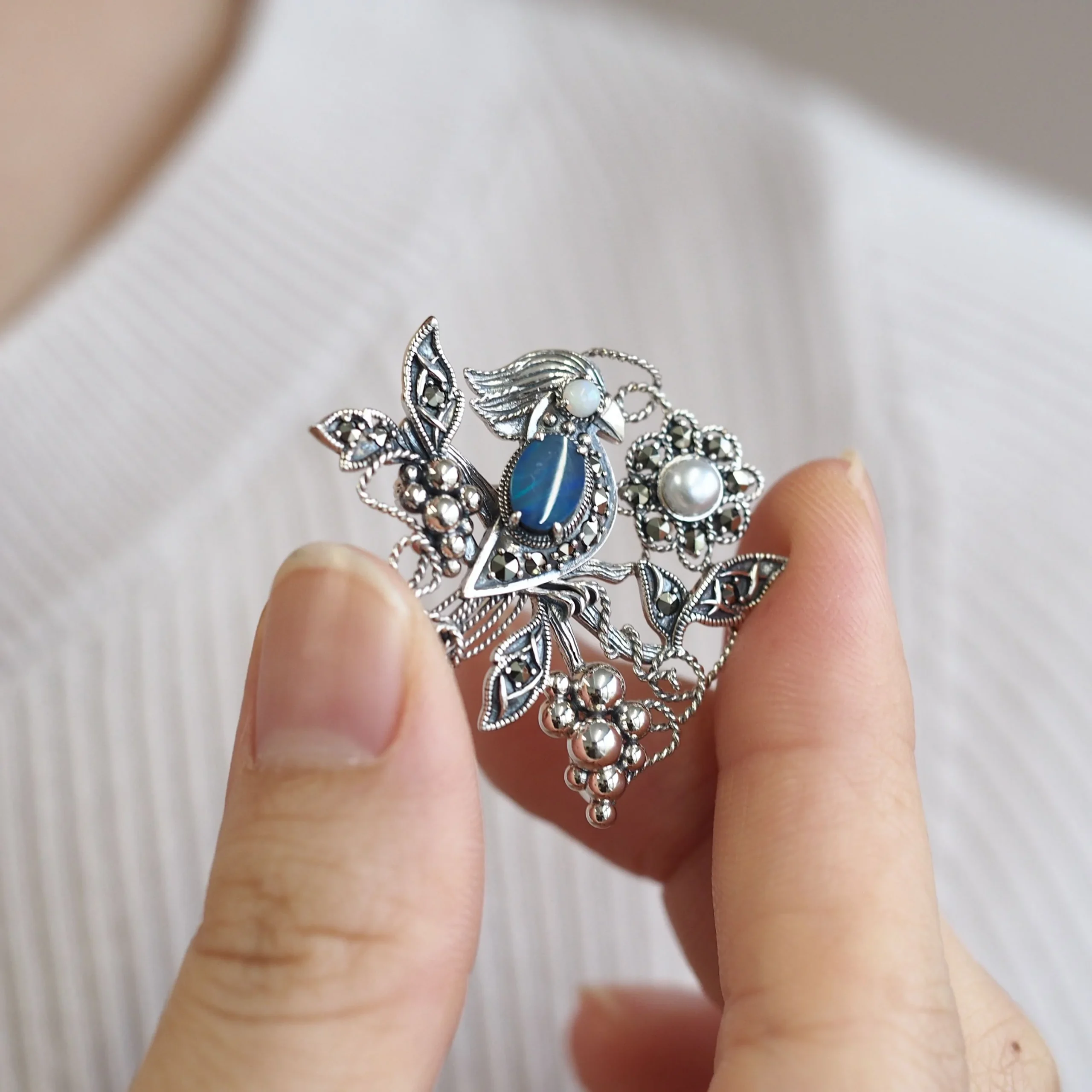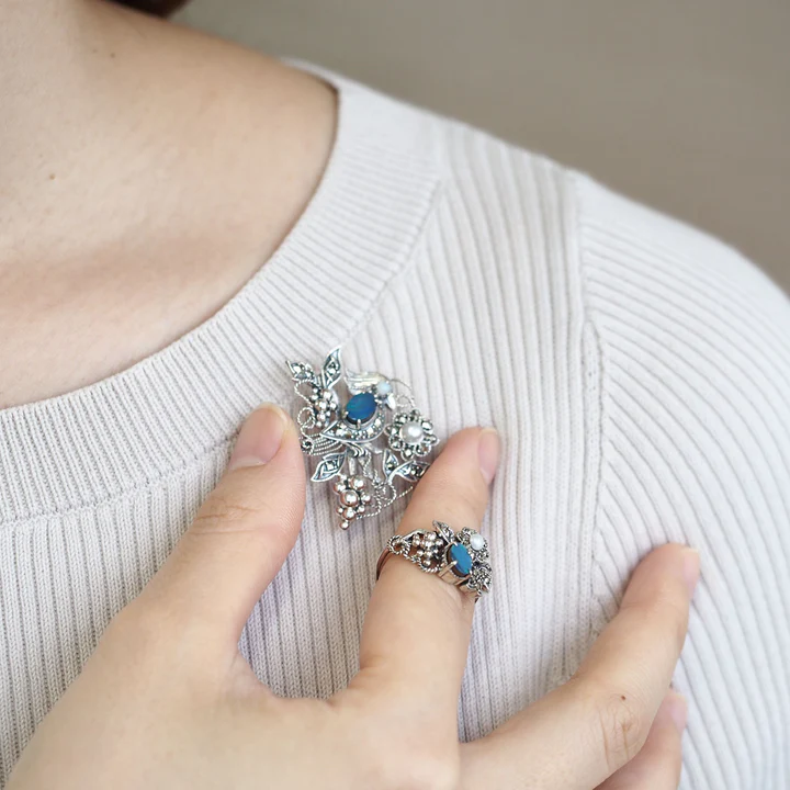 將藍色美麗的雙重蛋白石比作小鳥的身體所設計的可愛吊墜胸針。使用帶有歐洲風情的繩結工藝和玉飾輕巧地製作而成。像常春藤一樣卷曲的繩子帶來輕盈的感覺,看起來很時尚,而精心打磨的玉飾象徵葡萄。這件作品無論作為可愛小鳥的吊墜還是胸針,都能讓人心情愉悅。搭配帽子或大衣的領口也很出色。