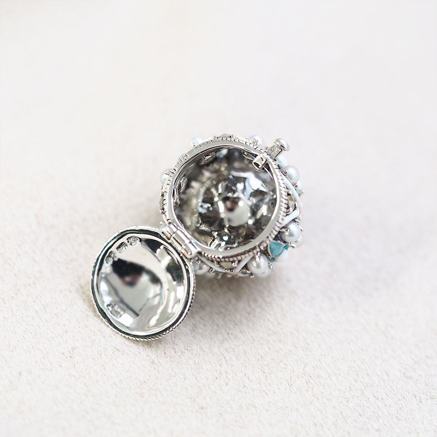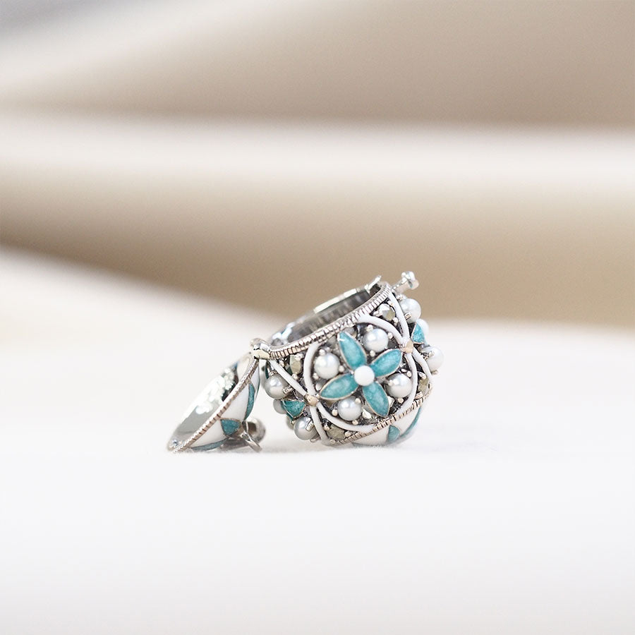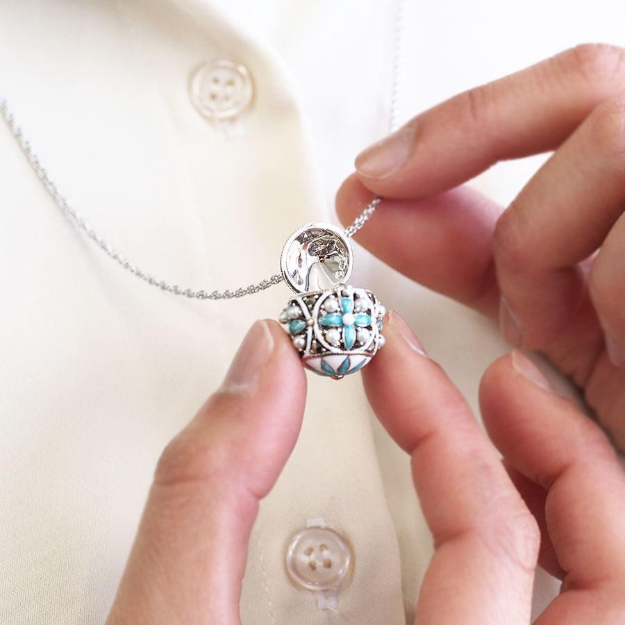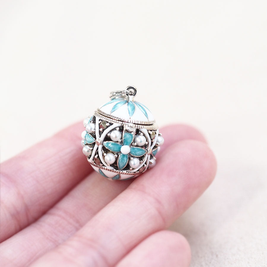 呢個係一款圓鼓鼓、好可愛嘅蛋型火箭墜飾。設計古典而簡約,上下各有花卉圖案裝飾,而裝飾之間嵌入嘅珍珠,增加咗立體感,從任何角度睇都非常可愛♪ 採用粉藍同白色嘅配搭,感覺清爽柔和。 按壓位有開口位,用指甲就可以輕鬆打開。 商品管理番号 704P0022-W225 サイズ 約15×15mm 素材 SV925 Marcasite、Pearl 注意事項 ※請注意,由於使用天然石材,因此可能存在個體差異、天然裂縫和內含物,並且實際天然石材的顏色可能會因瀏覽器而異。 ※不含鏈條 請按讚:喜歡 正在載入...