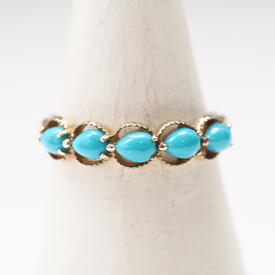 這是一款奢華的戒指,將五顆綠松石排列成如荷葉邊般的花邊圖案。一細看,綠松石採用了水滴形切割,增添了可愛感。花邊(Scallop)指的是歐洲的荷葉邊裝飾,名稱來自維納斯從海中浮現時乘坐的扇貝(Scallop)。