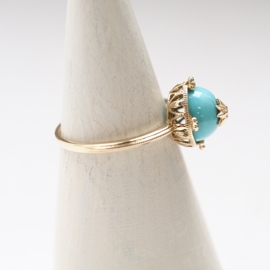 高切割的圓形寶石可愛地鑲嵌在綠松石上,鑽石星點綴其上。這款戒指設計帶有帆船舵的浪漫感,非常吸引人。自古以來,綠松石被視為能防禦災難的寶石,據說也是旅途中的幸運護身符。無論是慶祝或典禮場合都非常適合。