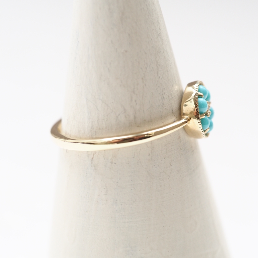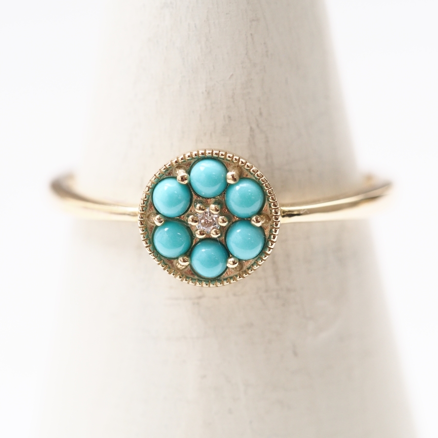 這是一枚以圓形作為主題的戒指。圓形蛋面土耳其石圍繞著鑽石,又創造出一個圓形。