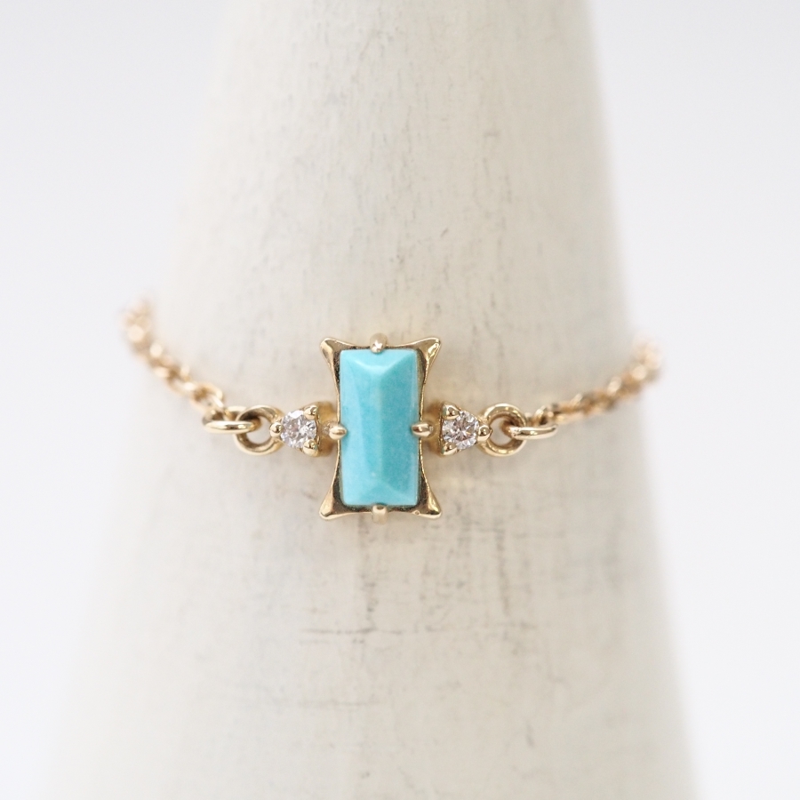 呢款鏈戒使用咗碌山黃金產品罕見嘅原創切割土耳其石。兩邊各配上一粒鑽石。