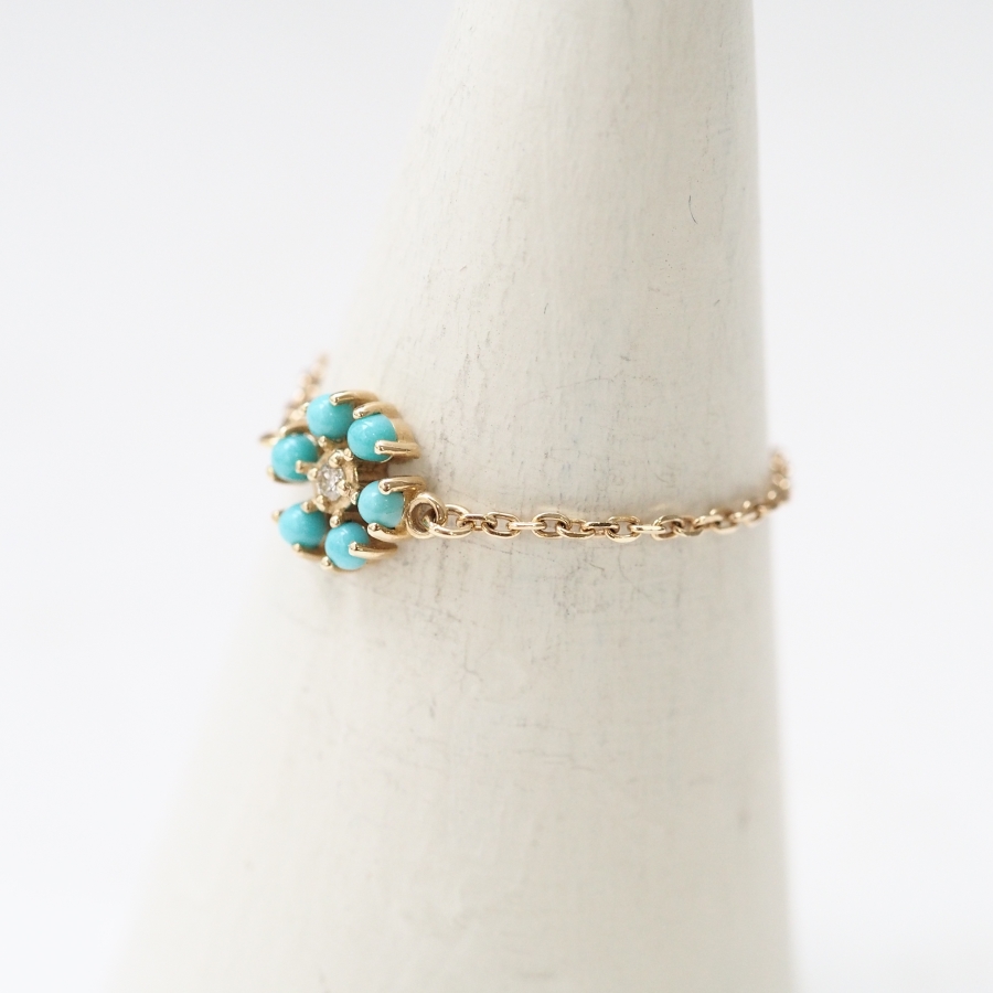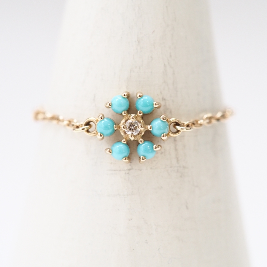 小小的花朵圖案以綠松石設計。鑽石的光澤與綠松石清新的藍色形成美麗對比,這是一款非常漂亮的戒指。