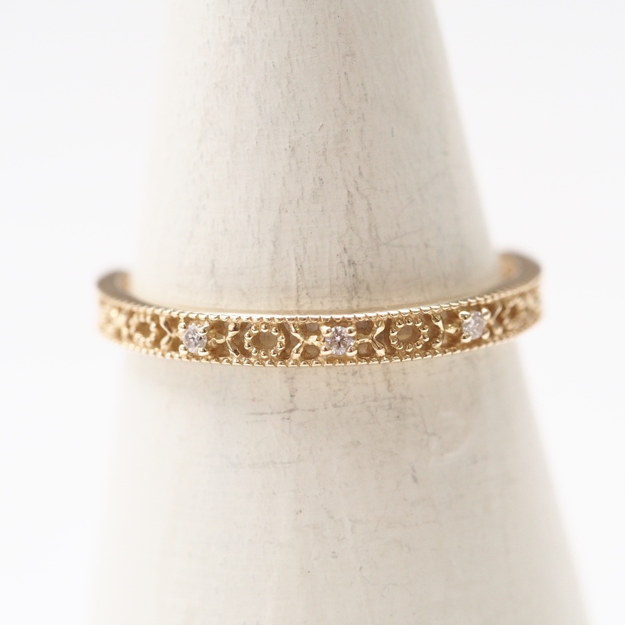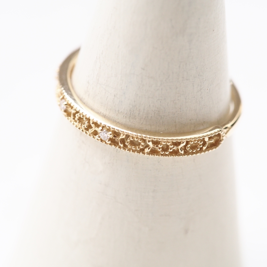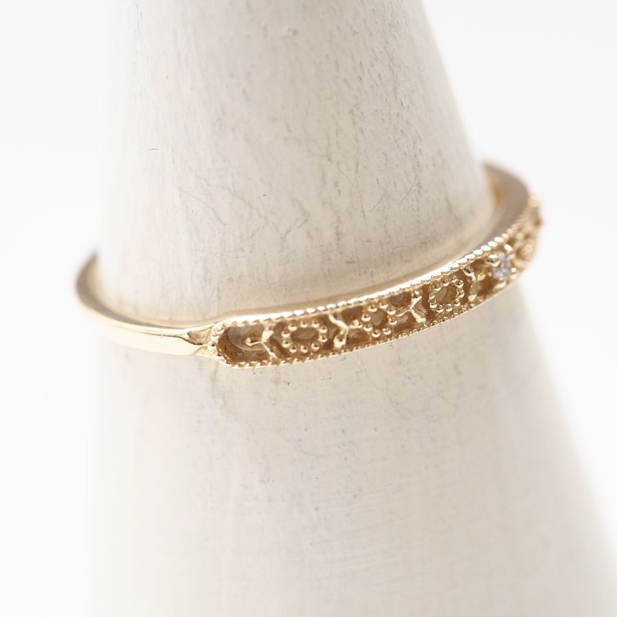 戒指係鑽石,加上細緻嘅米珠紋同透空花紋,線條幼細。唔會太搶眼,可以低調咁佩戴。