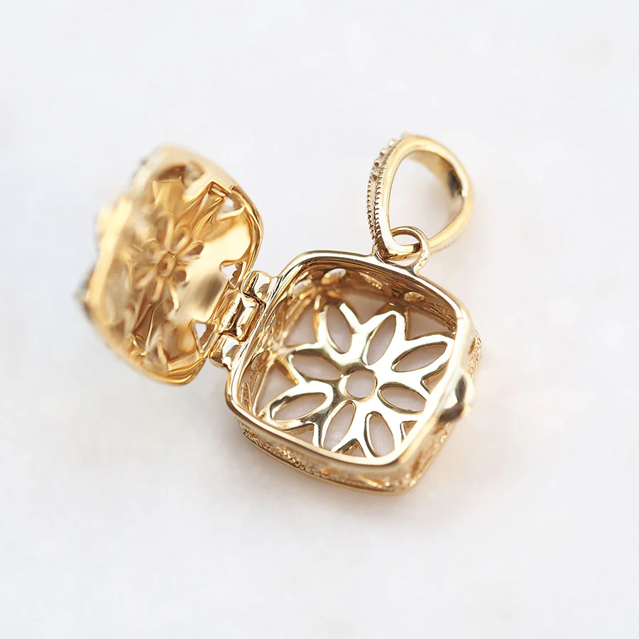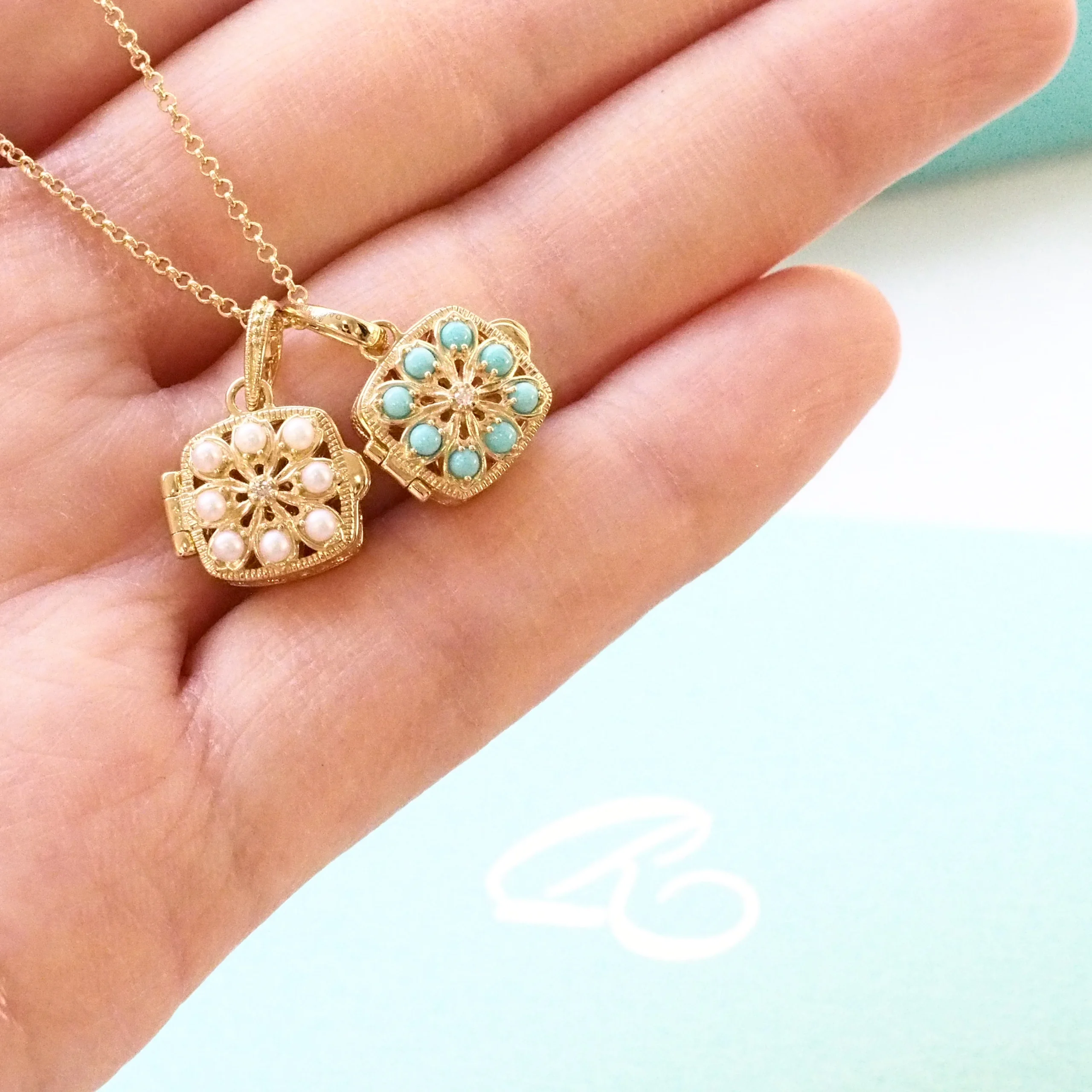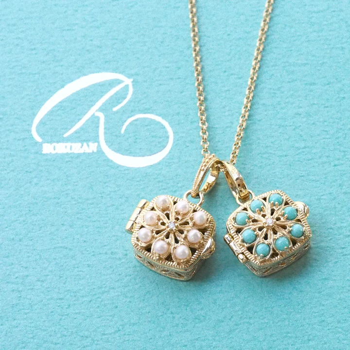 ~ 我哋透過獨特嘅努力,致力將古董珠寶所散發嘅「正統美」同「品味」帶返返現代,忠實再現維多利亞時代精緻繁複嘅裝飾工藝同設計嘅系列 ~★將鏤空蕾絲小盒子做成咀鏈吊墜。盒蓋排咗小塊松石做成花形,中間鑲咗鑽石。盒側嘅鏤空細緻度、以及吊墜可以開合嘅設計,集合咗好多有趣元素,係一個好可愛嘅盒形吊墜。