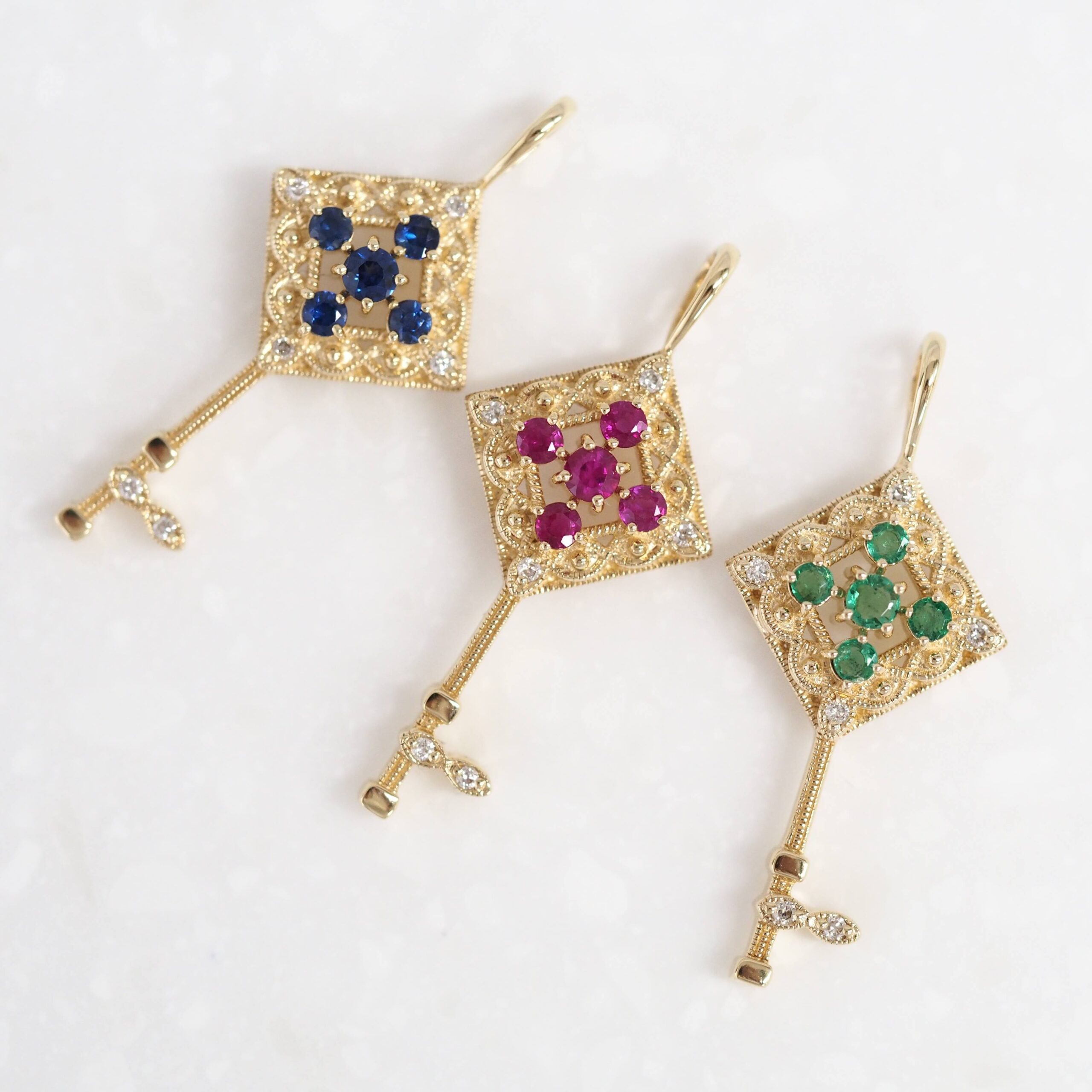 ~ 這個系列是為了將古董珠寶所散發出的「正統美感」和「高雅品味」在現代重生而不斷追求的成果,忠實地再現了維多利亞時代細膩而精巧的裝飾技巧和設計。 ~★細緻、閃閃生輝又可愛的鑰匙吊墜。蕾絲般的設計加上密釘裝飾,完成了如古董般的精緻外觀。彷彿施了魔法般,每一把細節精心打造的鑰匙都展現出極致講究。「慈愛」「忠貞」「德望」象徵著藍寶石,而比任何物質都堅硬美麗的鑽石,這件作品豪華地使用了世界四大寶石中備受喜愛的兩種寶石。