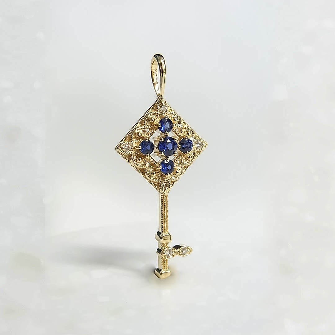 ~ 這個系列是為了將古董珠寶所散發出的「正統美感」和「高雅品味」在現代重生而不斷追求的成果,忠實地再現了維多利亞時代細膩而精巧的裝飾技巧和設計。 ~★細緻、閃閃生輝又可愛的鑰匙吊墜。蕾絲般的設計加上密釘裝飾,完成了如古董般的精緻外觀。彷彿施了魔法般,每一把細節精心打造的鑰匙都展現出極致講究。「慈愛」「忠貞」「德望」象徵著藍寶石,而比任何物質都堅硬美麗的鑽石,這件作品豪華地使用了世界四大寶石中備受喜愛的兩種寶石。