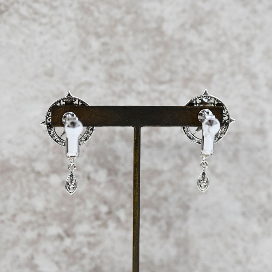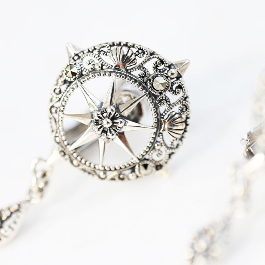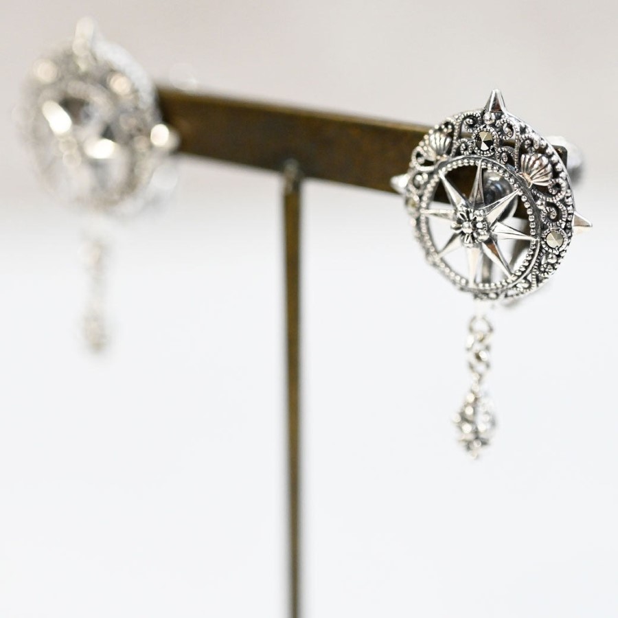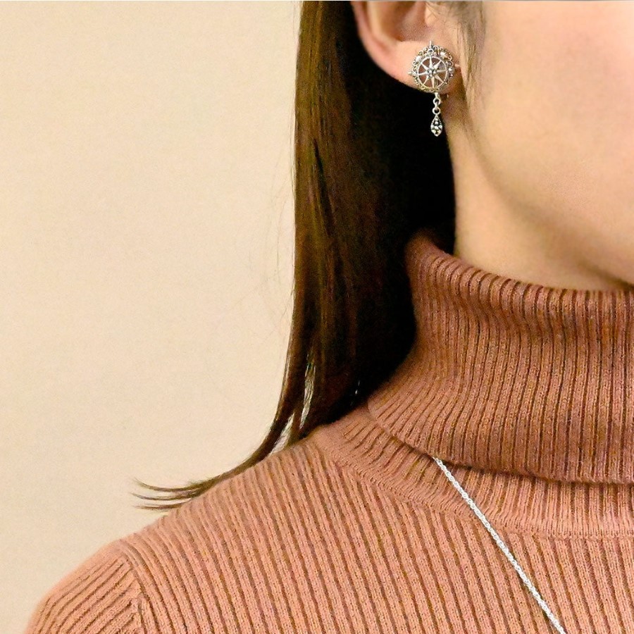 羅盤圖案的耳環設計,配以小水滴形狀的吊飾搖曳生姿。 指引前行道路的羅盤優雅閃耀,搖擺的水滴增添華麗感。 羅盤象徵指引方向,放大鏡則意味著細心觀察,佩戴它似乎能帶來幸福。中央裝飾星星或花朵,周圍的唐草圖案和貝殼增添古典韻味。馬卡石在耳邊閃耀。 無論日常佩戴還是特別場合都非常適合,是女人的理想飾品。