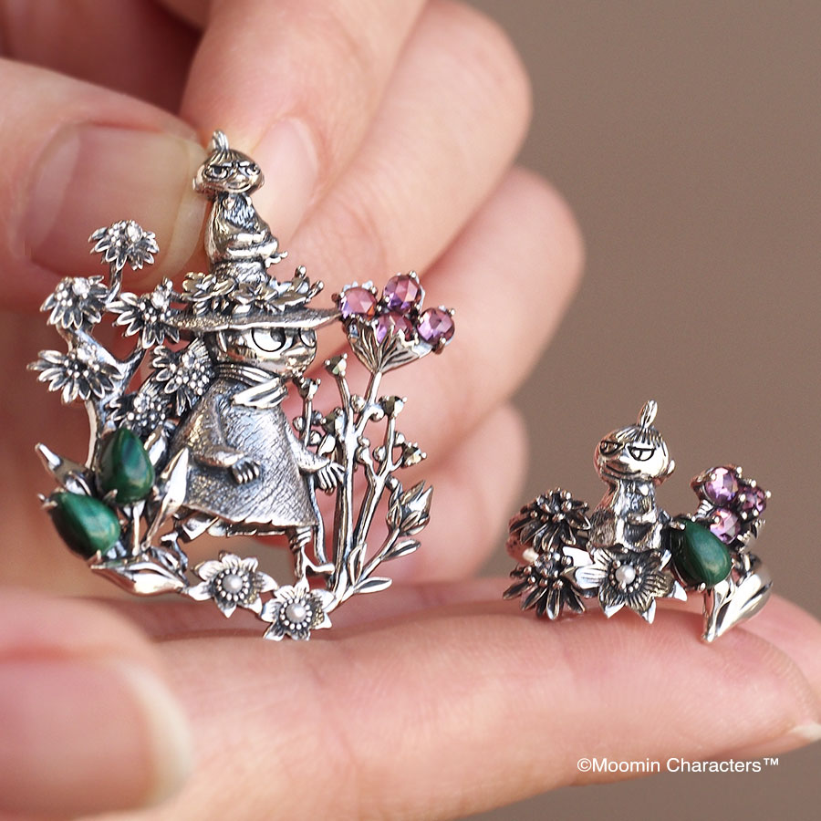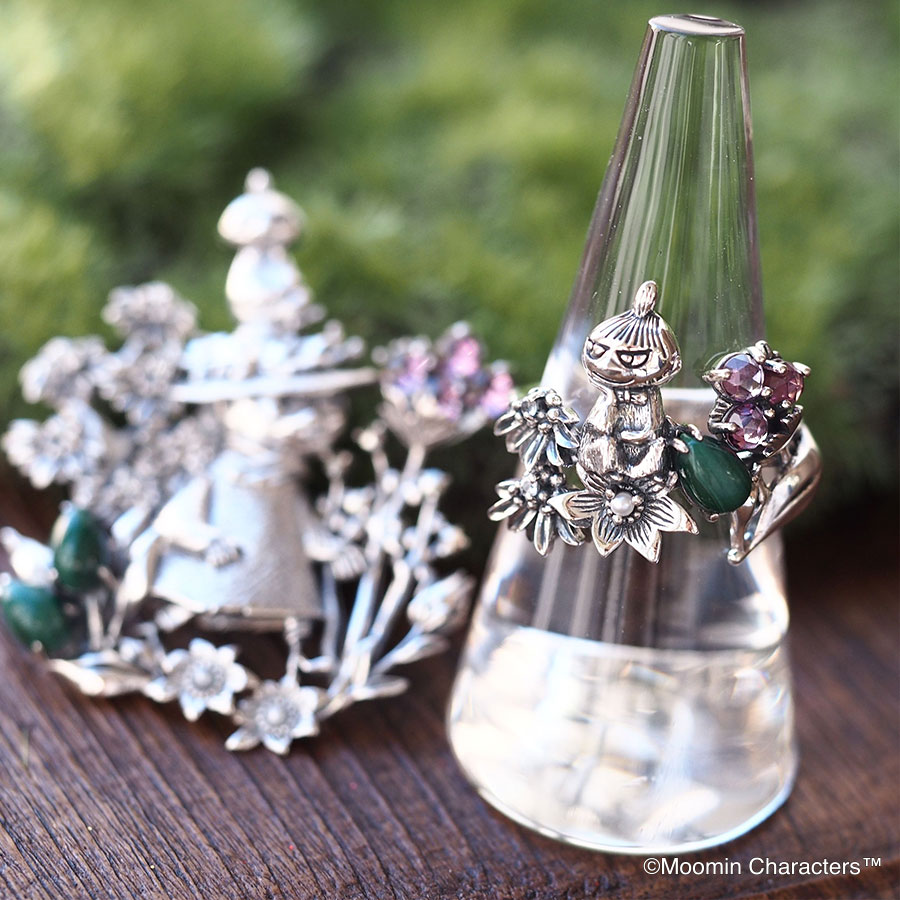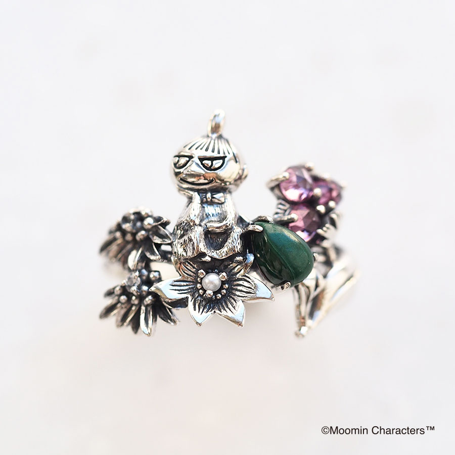 這枚戒指的設計主題是小美坐在花上,凝視著姆明和史力奇之間的友誼。