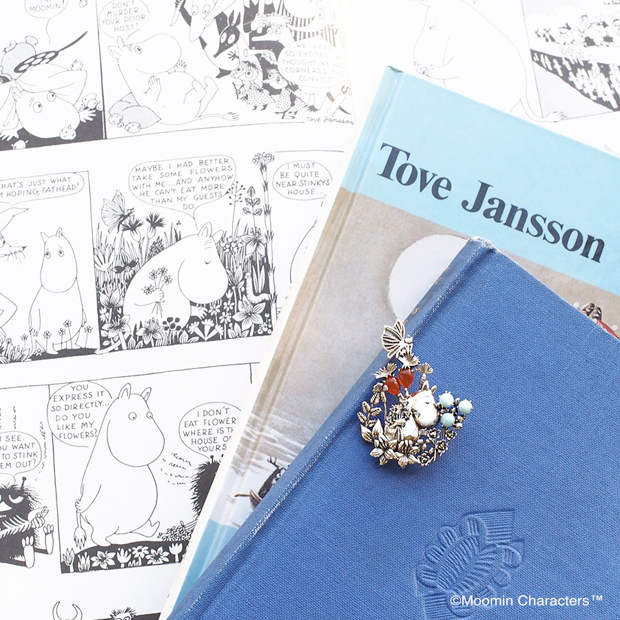 這款胸針吊墜取材自姆明漫畫《姆明的孤獨之地》,描繪了姆明採摘花朵的場景。 「姆明一家居住的山谷非常美麗。許多小動物在那裡快樂地生活,山谷裡長滿了高大 的綠樹。」正如書中所描述的那樣,姆明身邊總是圍繞著植物。這款精緻的胸針吊墜 描繪了姆明在大自然中悠閒採摘花朵的場景,植物則以斯堪的納維亞風格的紅玉髓和 拉利瑪石等色彩進行描繪,令人一眼望去便會感到溫柔,令人動容。