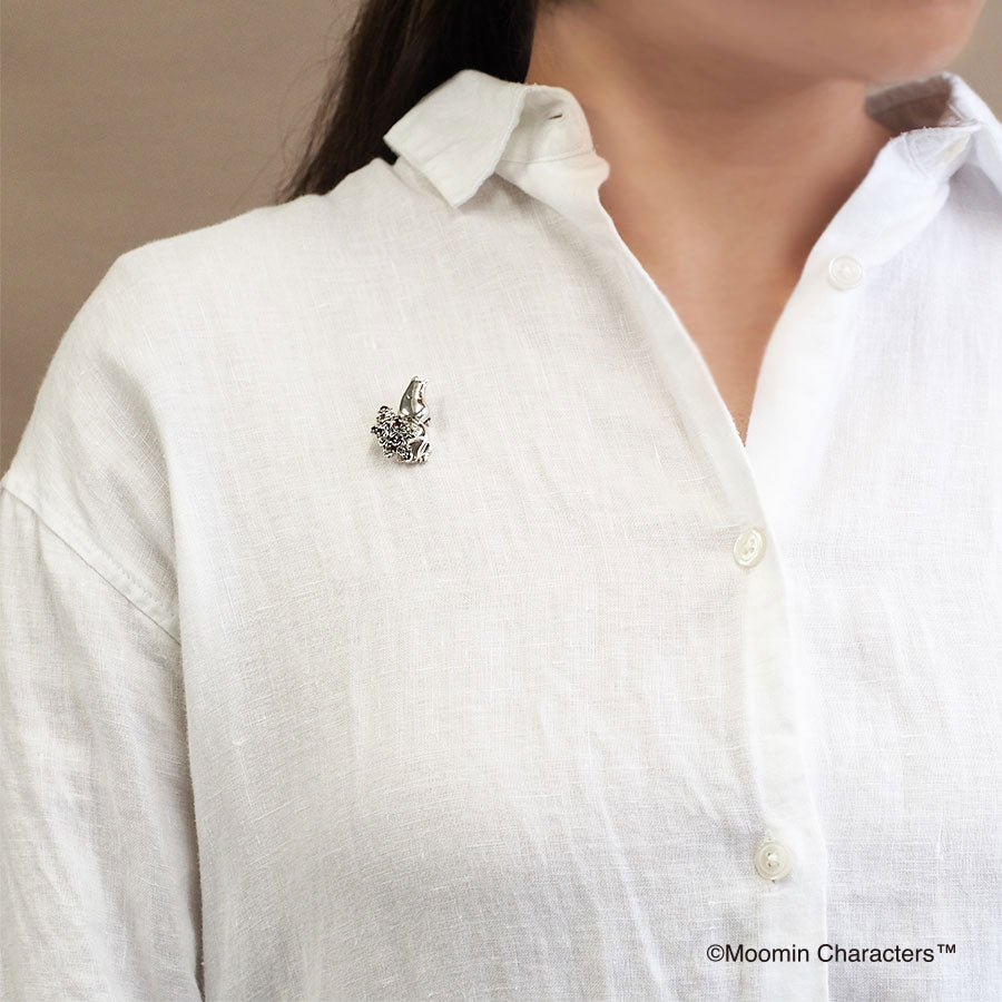 送給誰呢? 這款可愛的胸針吊墜,描繪的是姆明拿著一大束紅色花束,一臉尷尬和不安的樣子,彷彿要把它獻給別人。 花束上點綴著華麗的石榴石,營造出奢華的氛圍。 它採用仿古工藝,不會過於浮誇,尺寸也比較合適。 這是一款日常佩戴的百搭單品,可以作為帽子、圍巾、包包等配件的點綴,用途廣泛。