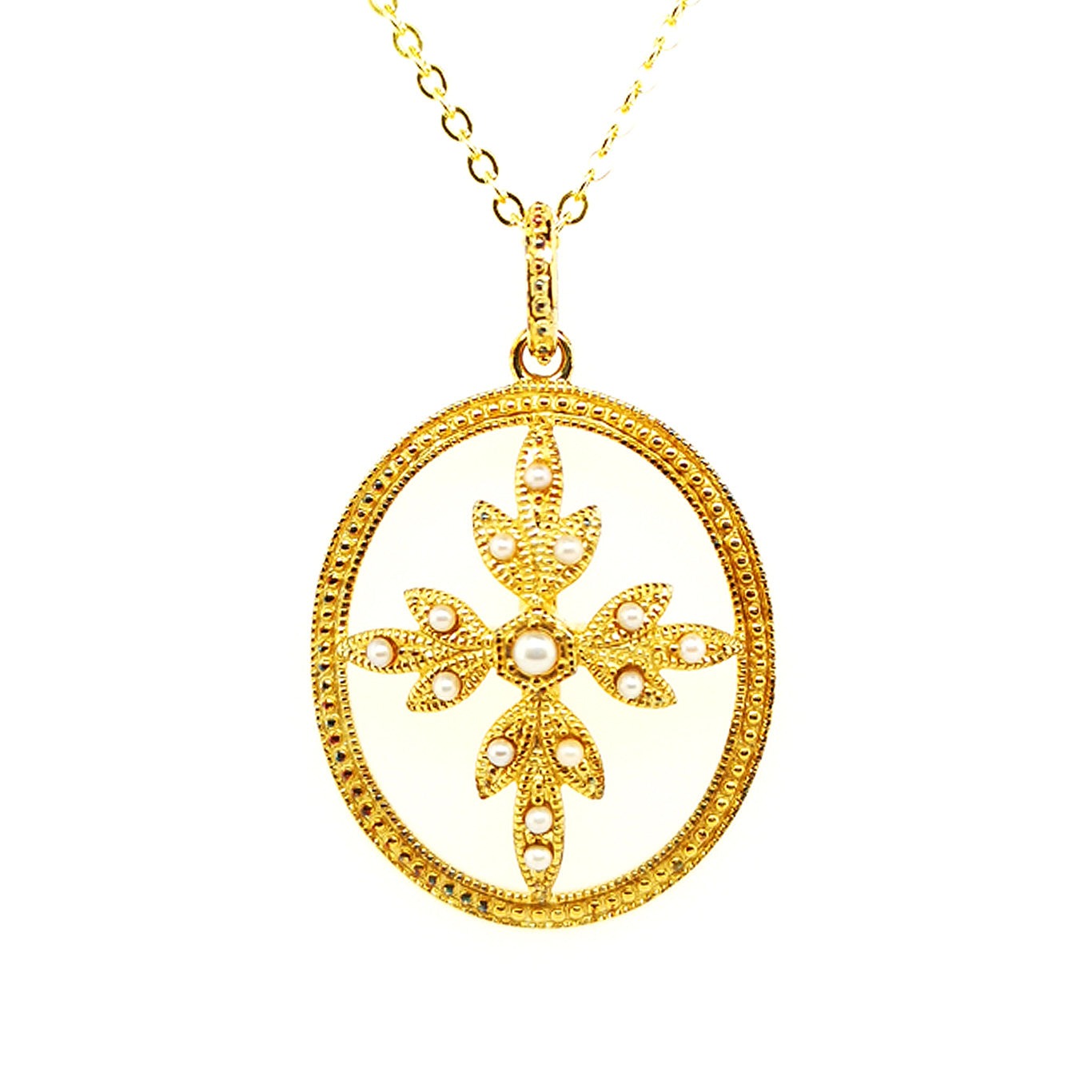 我哋喺基本嘅硬幣形吊墜啲橢圓形外型上,加咗用樹葉同小珍珠做成嘅十字架。用咗金色調增加華麗感,戴起嚟輕盈舒適,好有魅力。
