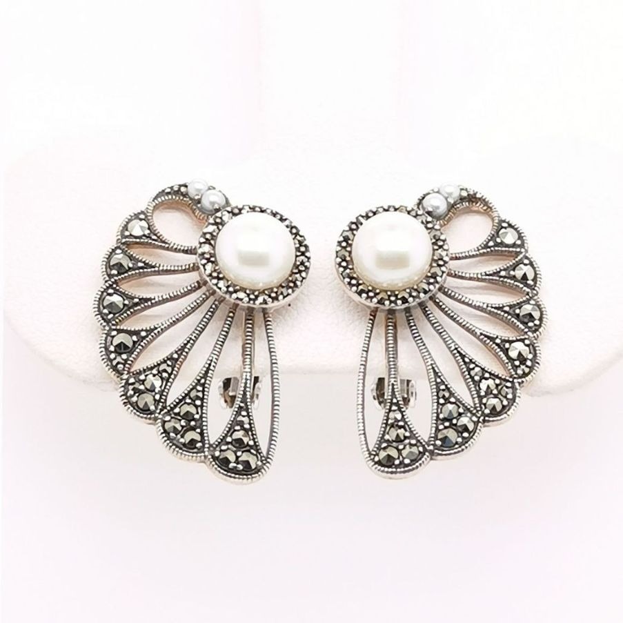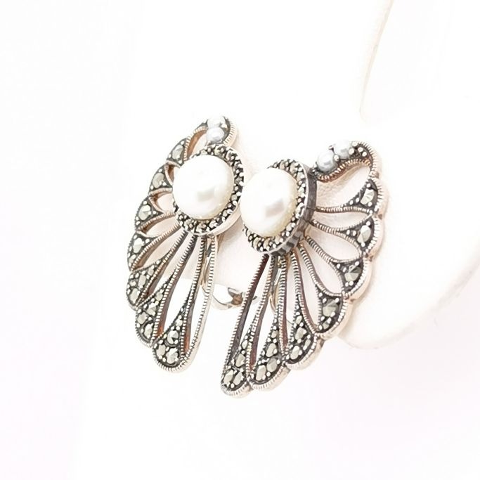 💎 2025–2026 銀飾運勢指南|「貝母扇珍珠」925銀馬克賽石珍珠扇耳環(正圓淡水珍珠+復古扇貝滿鑲|無耳洞夾式) 「一戴即老錢貴婦,氣場由耳仔開始蔓延」