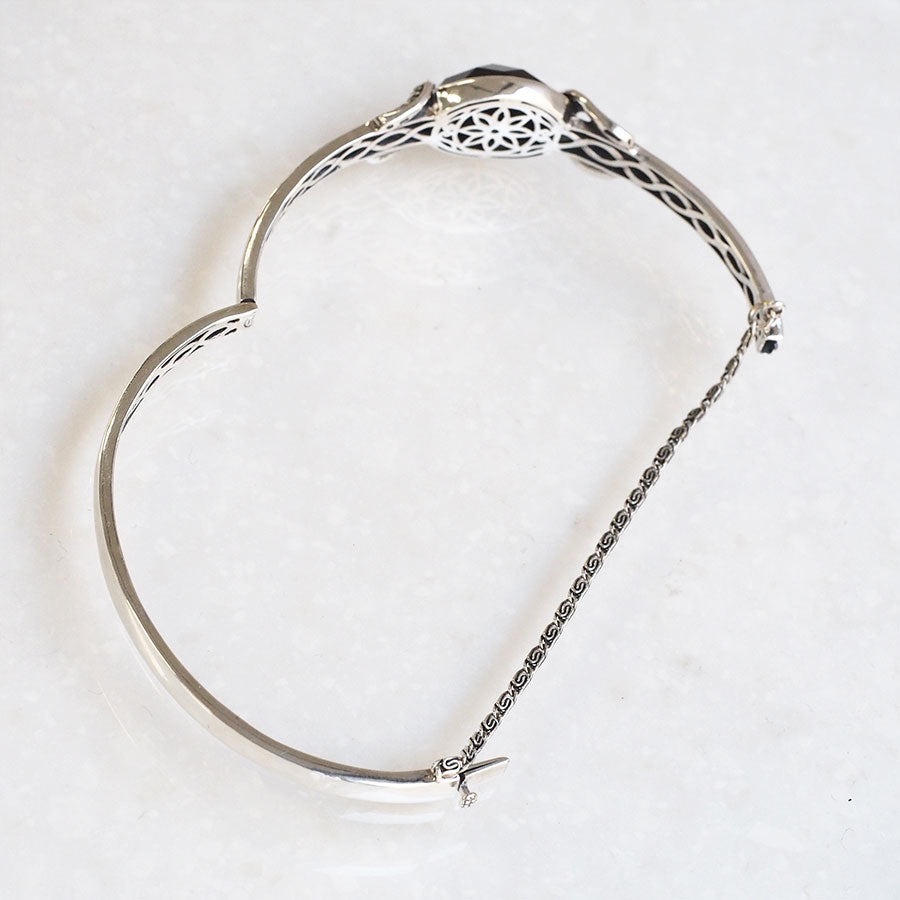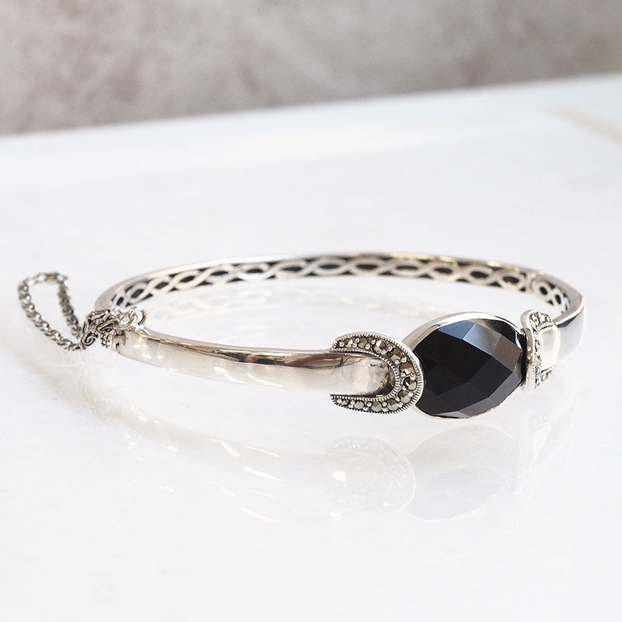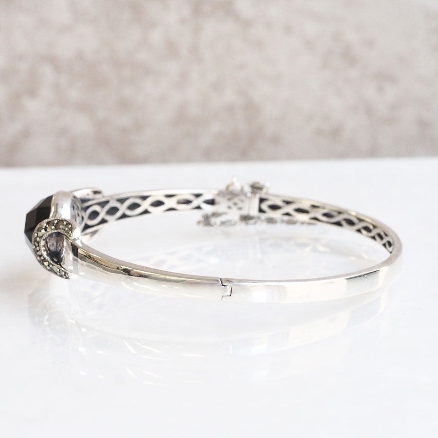 中央切割面黑瑪瑙,深不見底又閃到犯規!兩邊馬蹄扣滿鑲馬克賽石,代表「馬到成功+逢凶化吉」,內圈鏤空雕花+安全鏈,戴落去完全唔鬆,貴氣又硬淨!一戴即刻變冷都女王/職場最有份量嘅手腕。