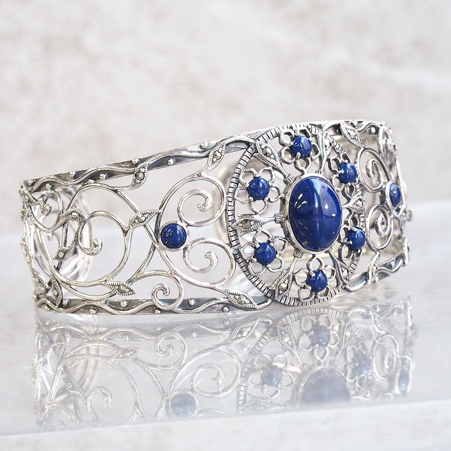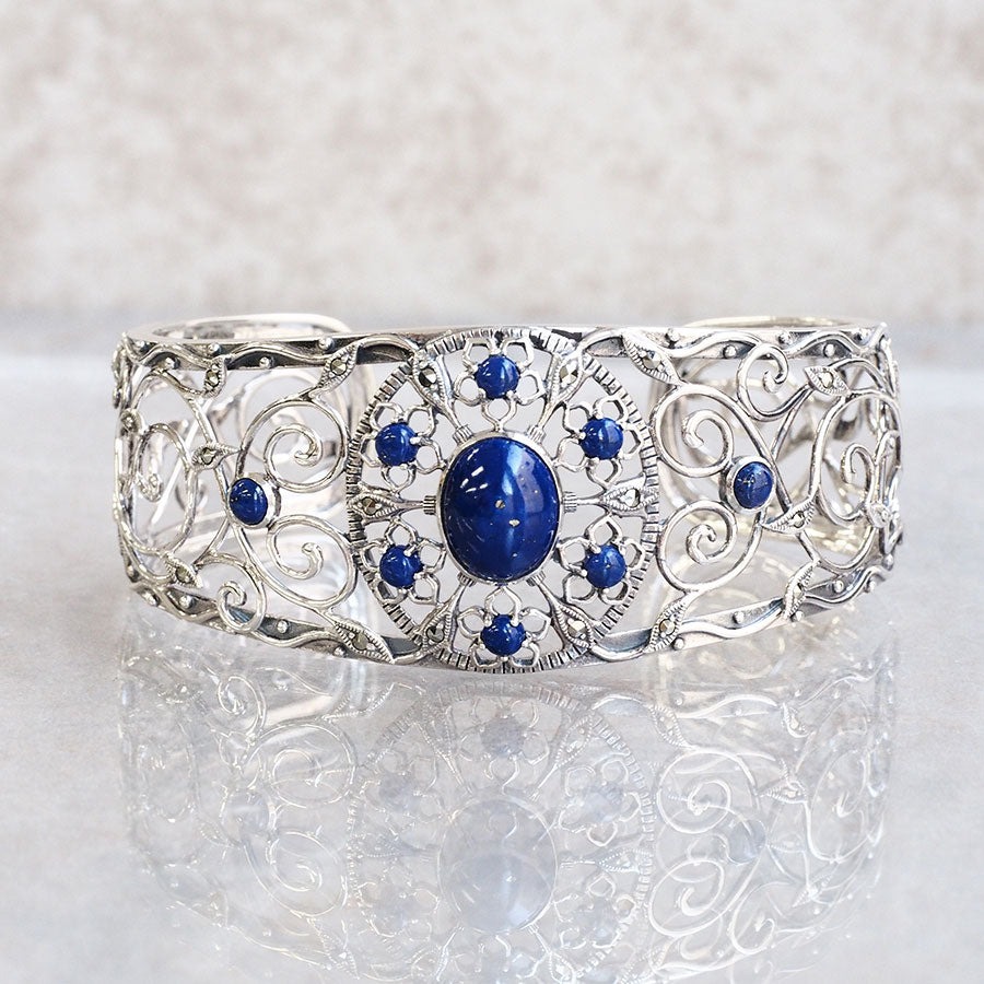 中央深藍帶金星阿富汗青金石(皇帝級色),周圍8粒小青金+滿鑲馬克賽石,藤蔓纏繞像權杖一樣,30mm寬度戴上手秒變女王/貴婦/女總裁!鏤空設計超輕身,完全唔壓手,仙+霸氣兩兼得!