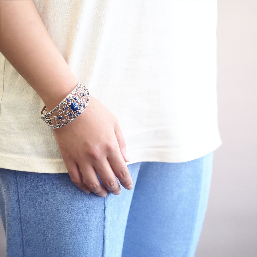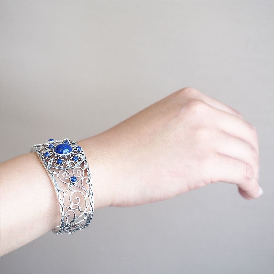 蔓藤自由伸展的樣子非常可愛,而中央的大花則精神抖擻、堂堂地綻放著。深藍色的青金石與銀色基底的對比非常美麗。手鐲的寬度約有30毫米,但由於設計帶有透視感,所以給人非常輕盈的印象。