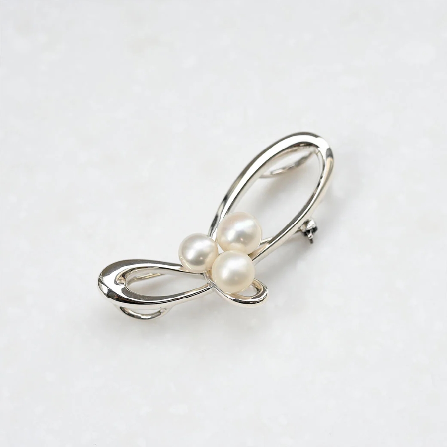 呢件銀色胸針吊墜擁有流暢嘅曲線,非常美麗,仲優雅地配上三顆淡水珍珠,係一件特別嘅作品。