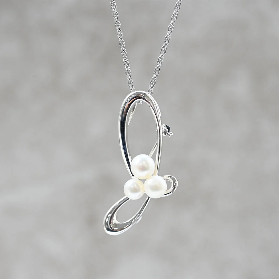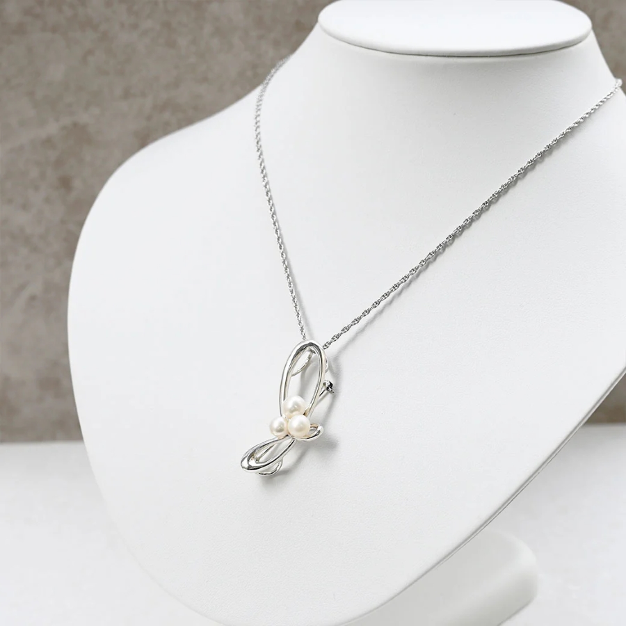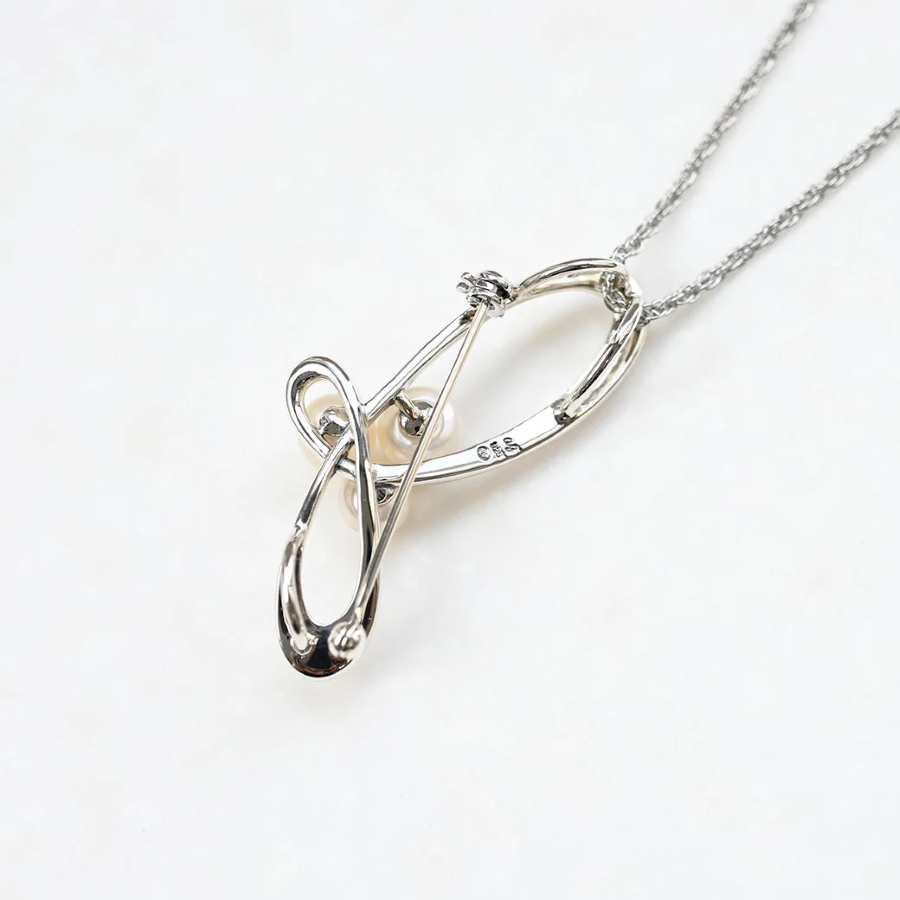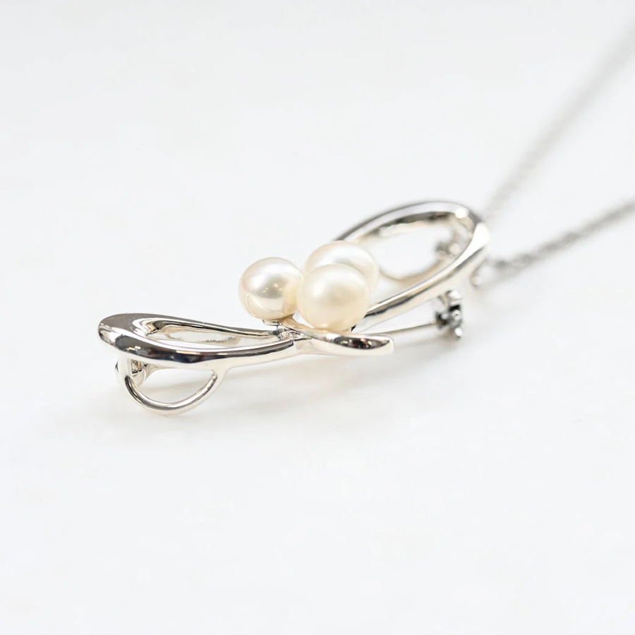 呢件銀色胸針吊墜擁有流暢嘅曲線,非常美麗,仲優雅地配上三顆淡水珍珠,係一件特別嘅作品。