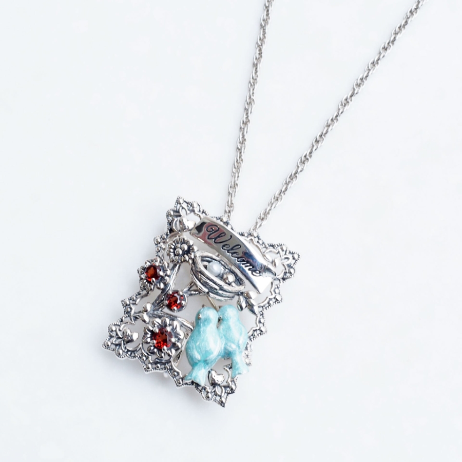 (925銀 + 天然石榴石(Garnet)+ 淡水珍珠(Pearl)+ 藍色琺瑯小鳥 + Welcome 牌|吊墜/胸針/戒指三用)