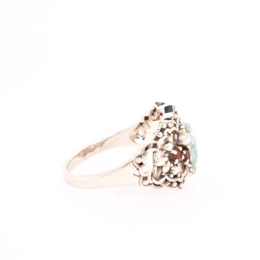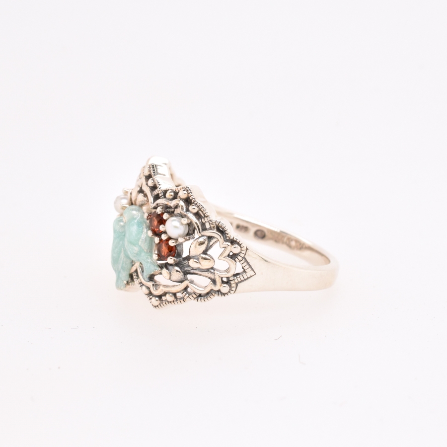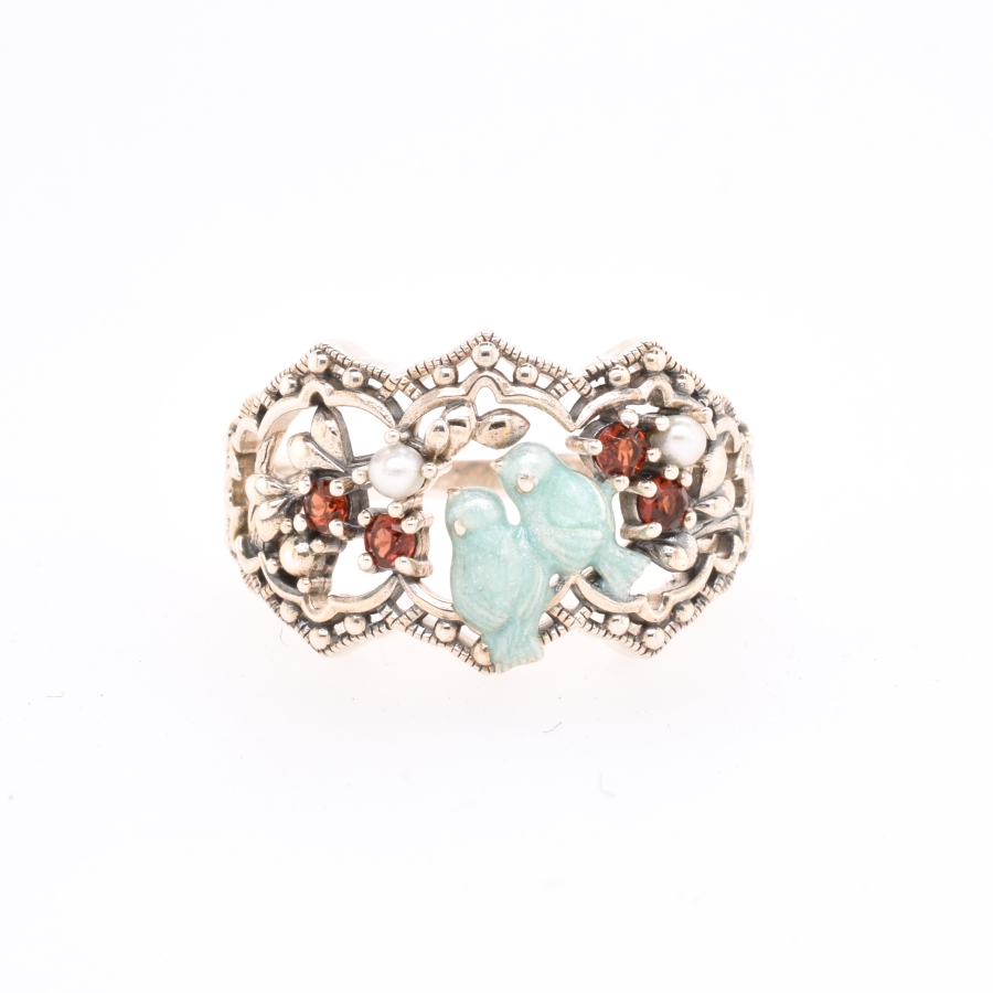被認為是幸福象徵的藍色小鳥,親密地依偎著,凝望著以石榴石和珍珠製作的花朵,可愛的戒指。