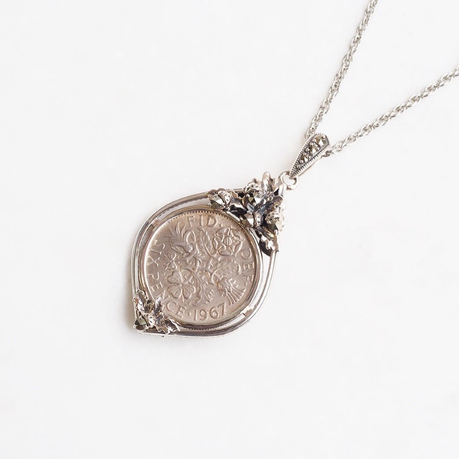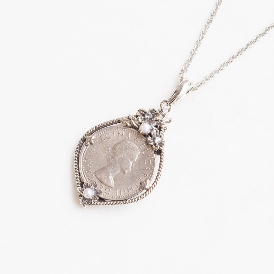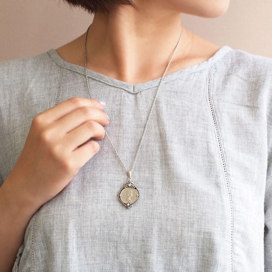 在英國,6便士硬幣被視為能提升財運的幸運護身符。硬幣正面刻有伊莉莎白二世女王(Elizabeth Queen),背面則設計象徵英國的玫瑰、薊花、水仙及三葉草。這款招來幸福的6便士硬幣正面以傳承於英國王室的月桂葉為靈感,背面則搭配象徵幸運的橡實(橡子),製作成2用吊墜頭。於英國及愛爾蘭等地,人們相信佩戴6便士硬幣一生都不會缺錢,是提升財運的幸運物品。作為護身符的吊墜當然設計也非常美麗,非常適合作為禮物。與家人或朋友佩戴相同款式,增進彼此情誼也是非常棒的選擇。
