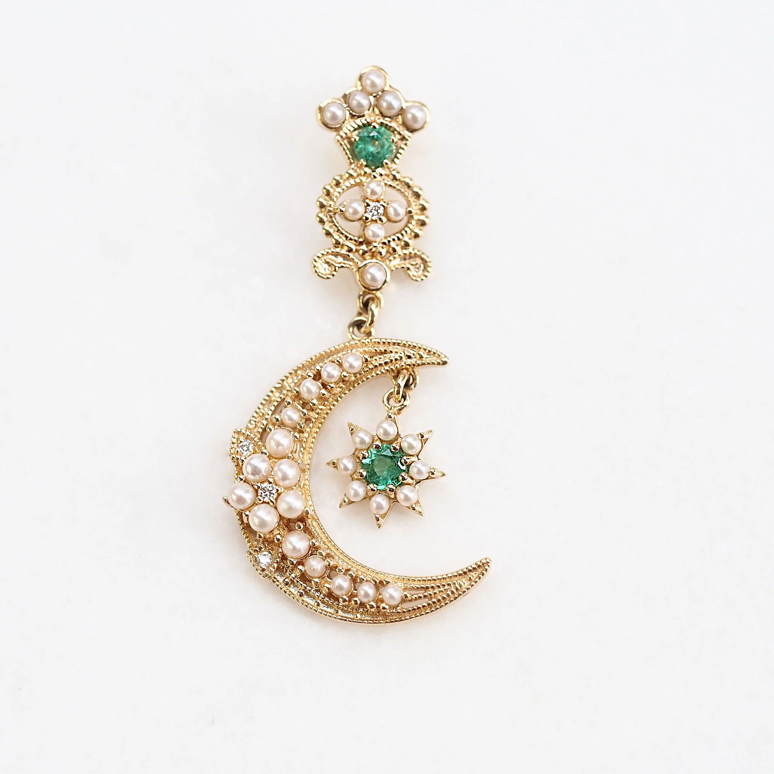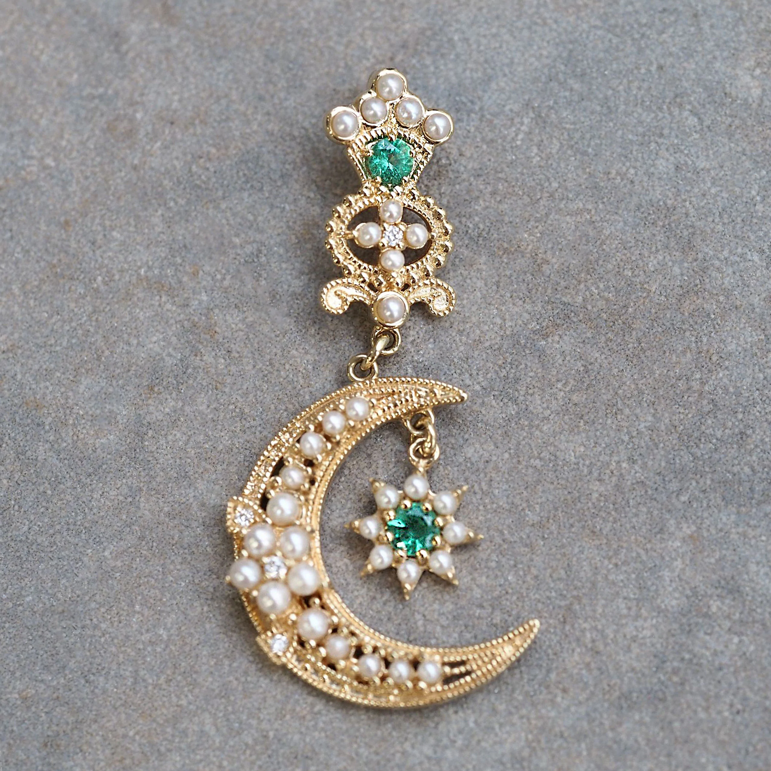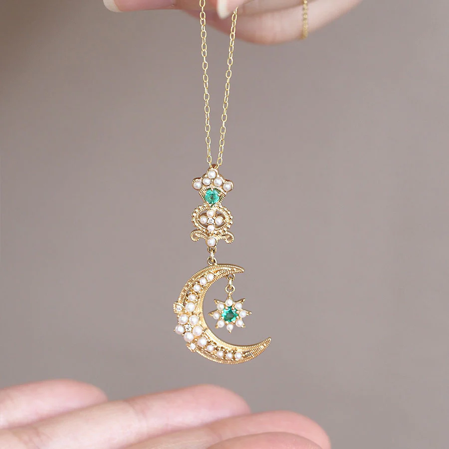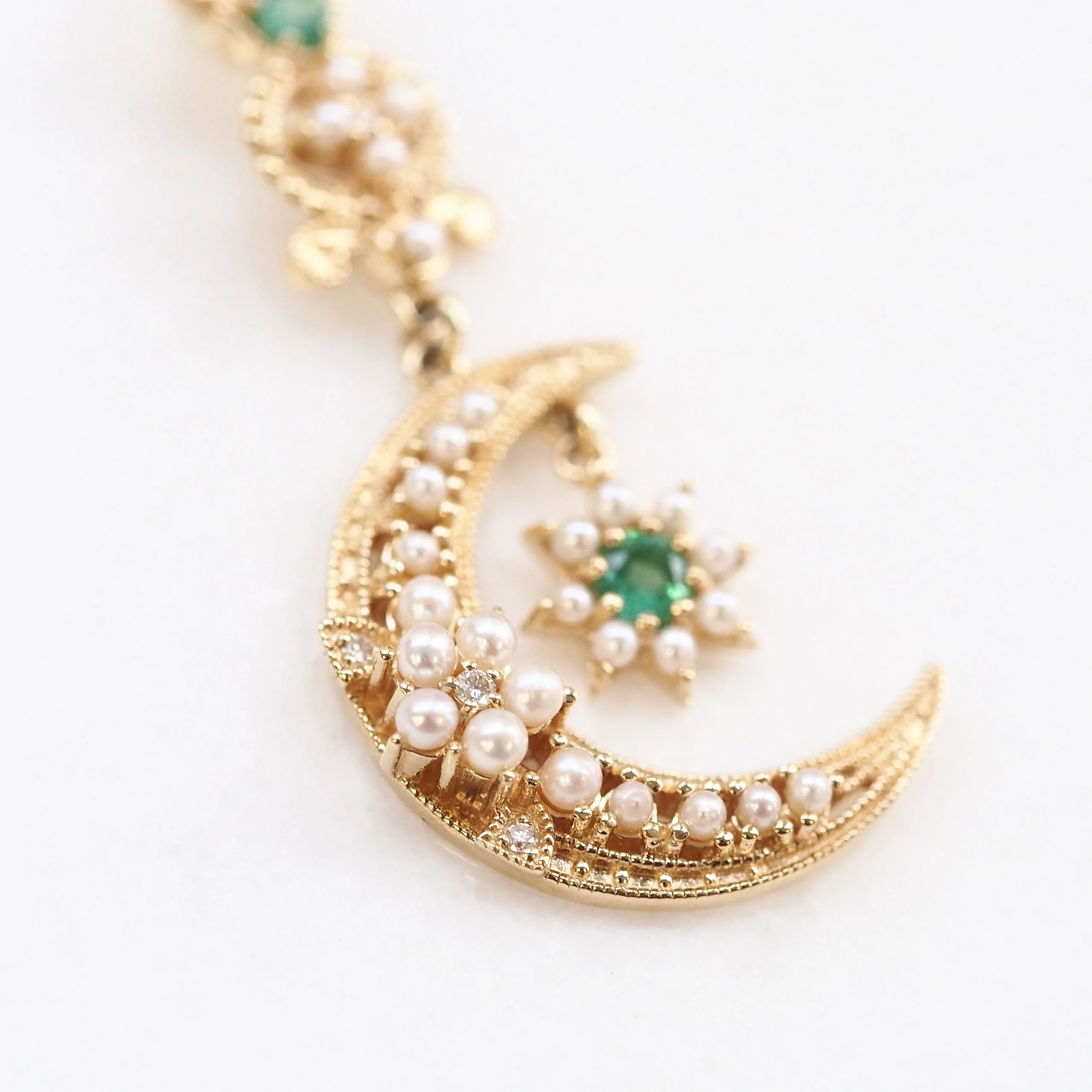 月牙上點綴著珍珠絲帶和花朵,中央則鑲嵌著祖母綠和珍珠星辰圖案,營造出奪目的設計。