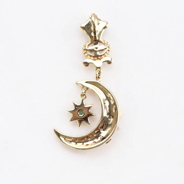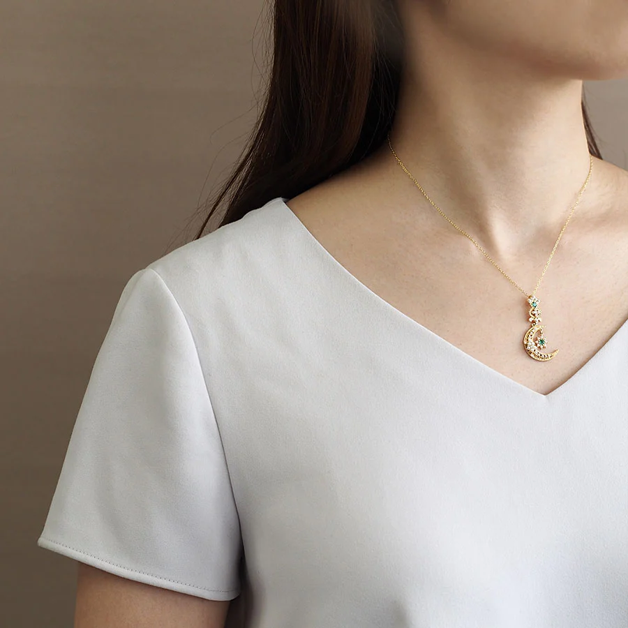 這款吊墜的頭部飾有搖曳的月牙和星星圖案,散發著女性的柔美與優雅。