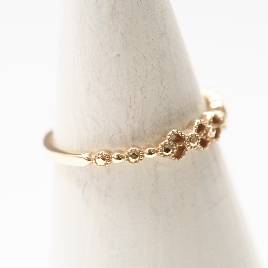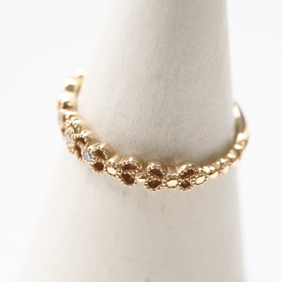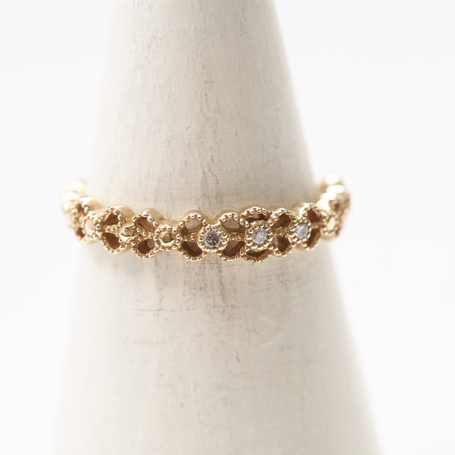 这是一枚镶嵌钻石、刻有微细雕刻和镂空花纹的戒指。