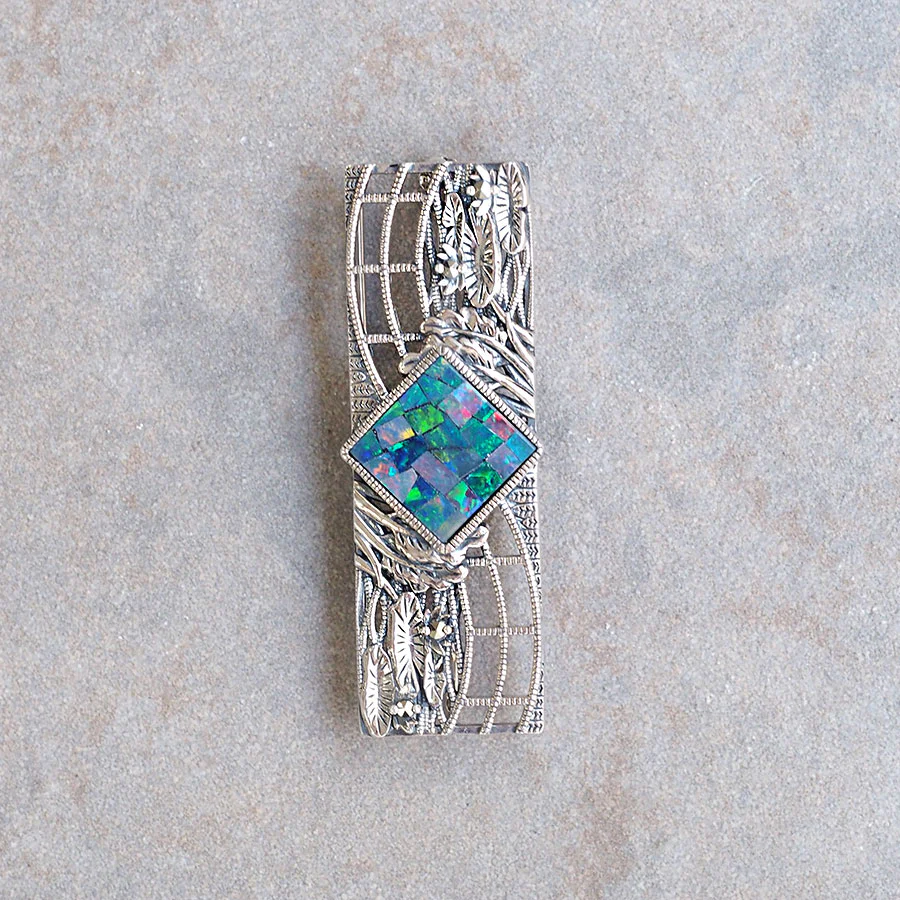 馬賽克蛋白石多彩嘅色彩同莫內嘅睡蓮色調非常配合,而佢上下用地金設計嘅睡蓮葉,以及花部位鑲嵌嘅馬爾卡賈石,更加突顯出馬賽克蛋白石嘅魅力。