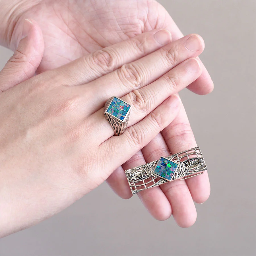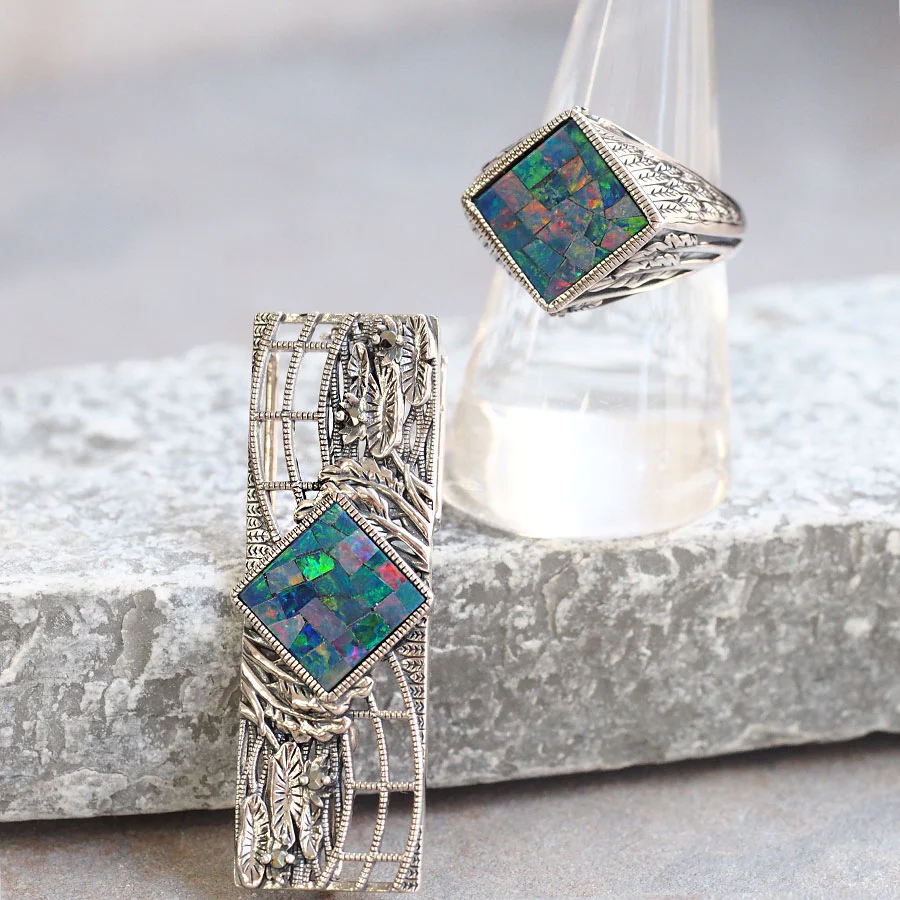 使用咗由天然蛋白石拼成馬賽克圖案嘅馬賽克蛋白石。