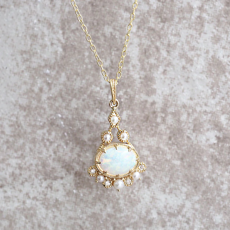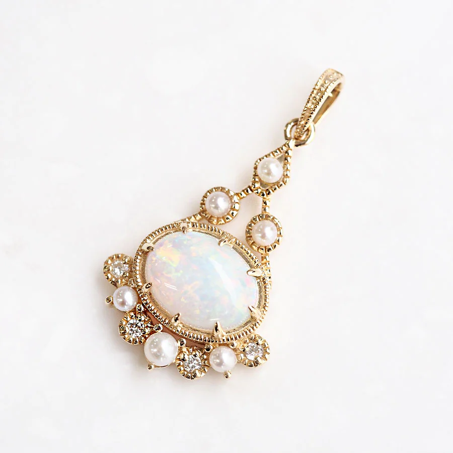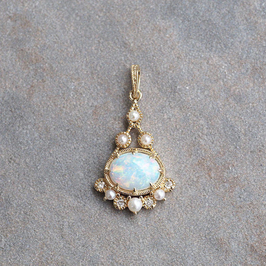一顆飽滿的蛋白石位於中心,周圍環繞著精緻的珍珠和鑽石,散發出精緻的光芒。